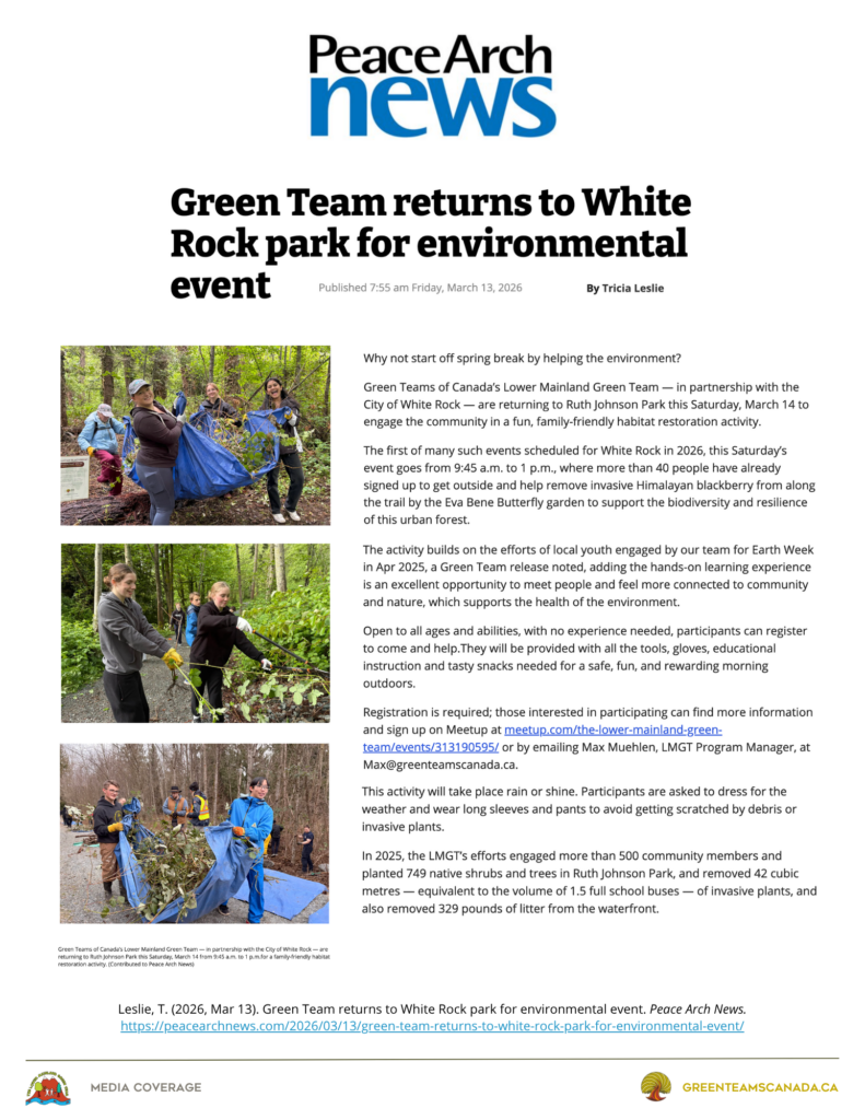 Leslie, T. (2026, Mar 13). Green Team returns to White Rock park for environmental event. Peace Arch News. https://peacearchnews.com/2026/03/13/green-team-returns-to-white-rock-park-for-environmental-event/