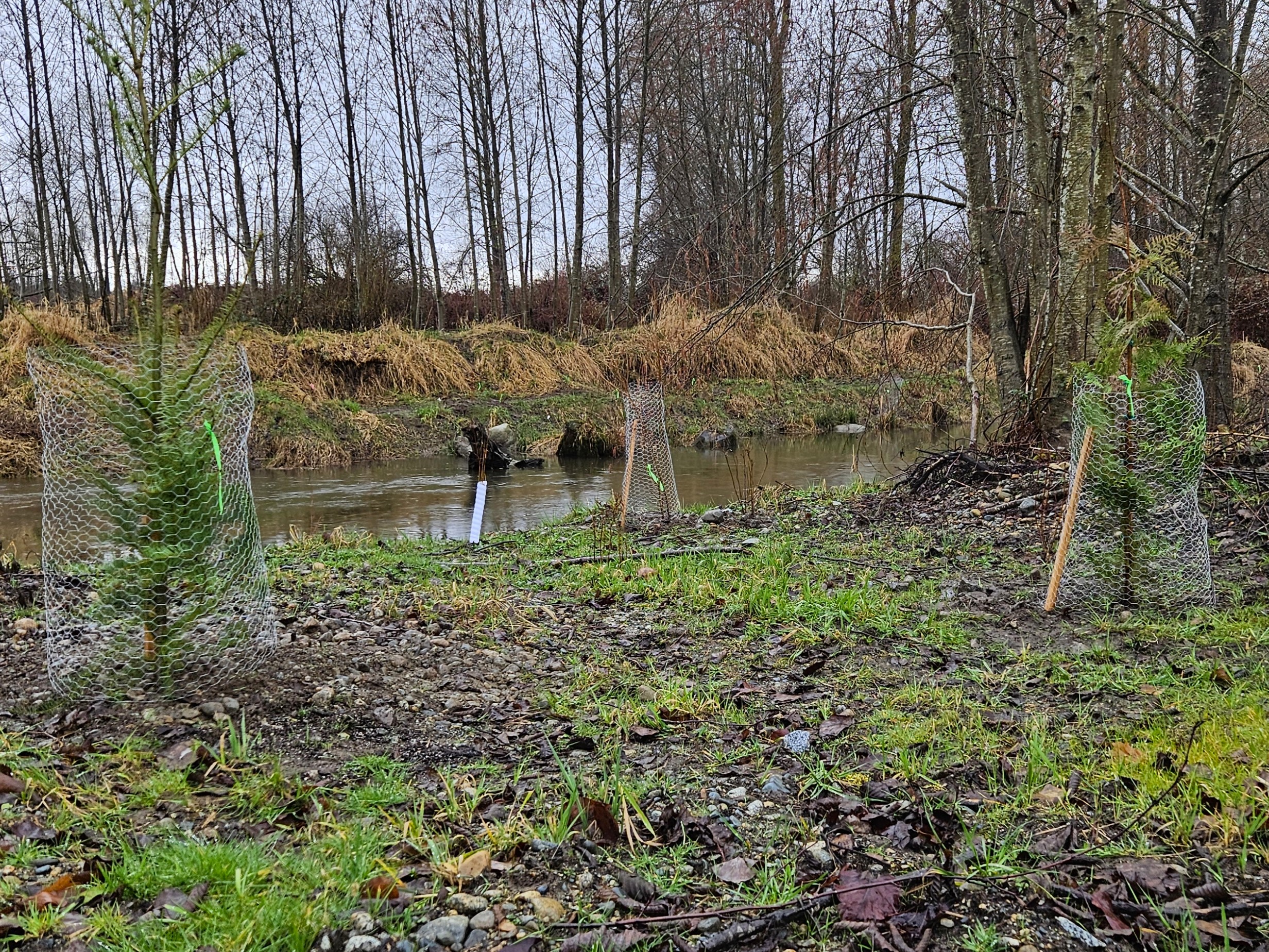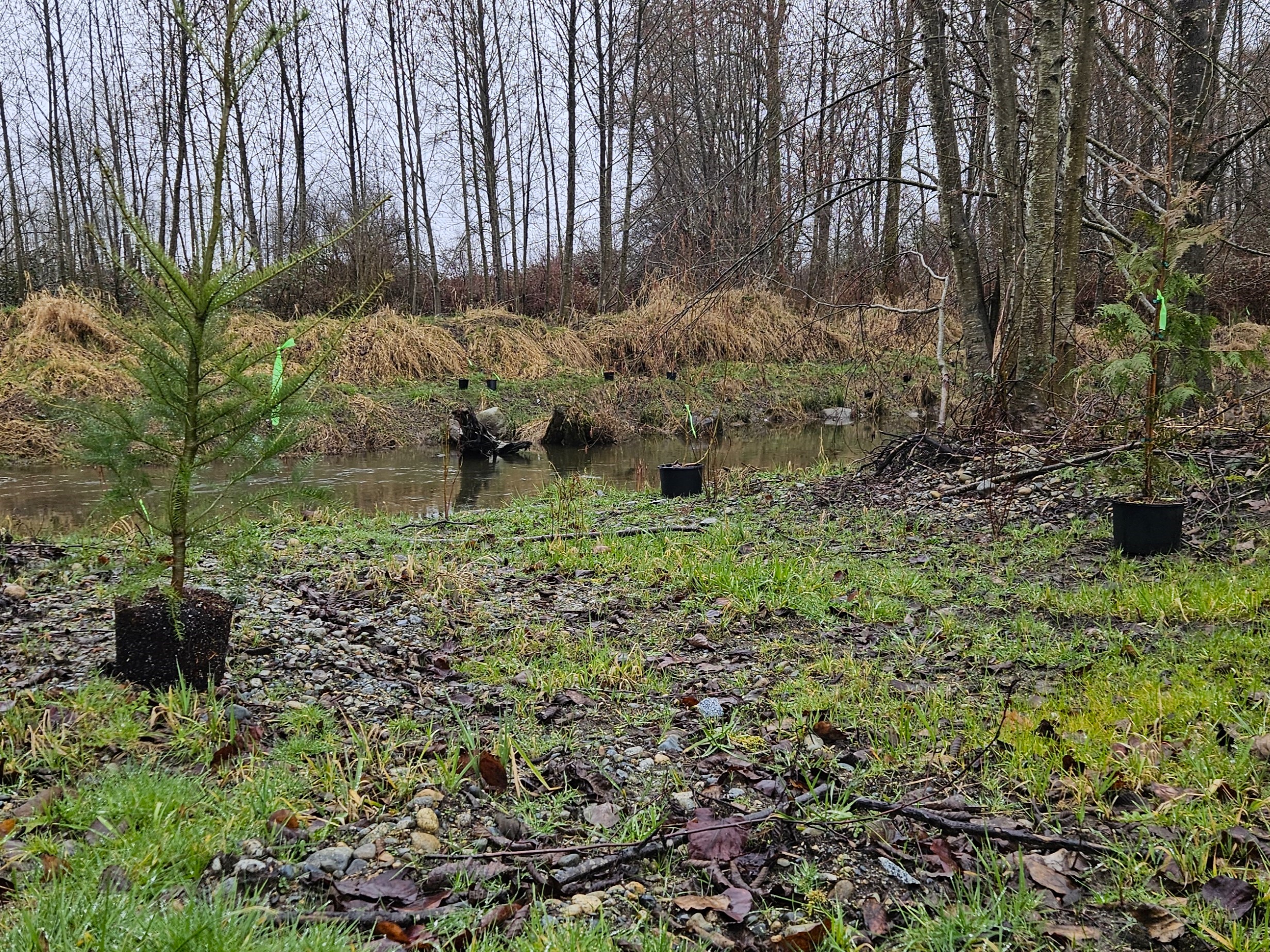 - Trees were planted throughout the site but mainly in the upper & lower Channel to provide stability, prevent erosion, and to add shade to reduce blackberry & reed canary grass growth!