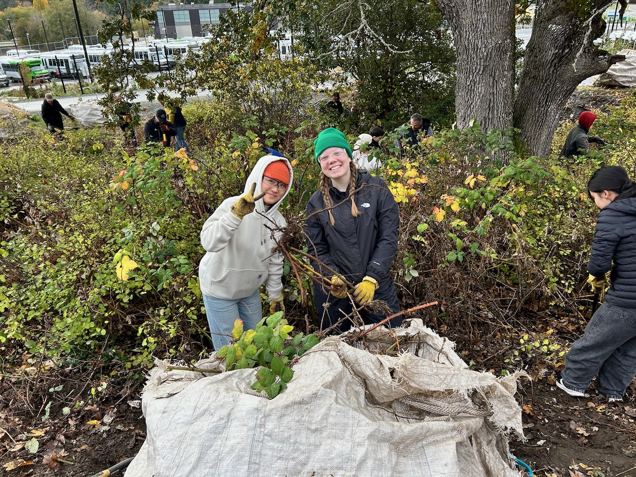 - 5 Green Teamers (Bahar, Leo, Mark, Porter & Emily) participated in the “who can pull up the biggest Himalayan Blackberry root crown” game. We couldn’t decide which root was bigger so everyone won a prize!!