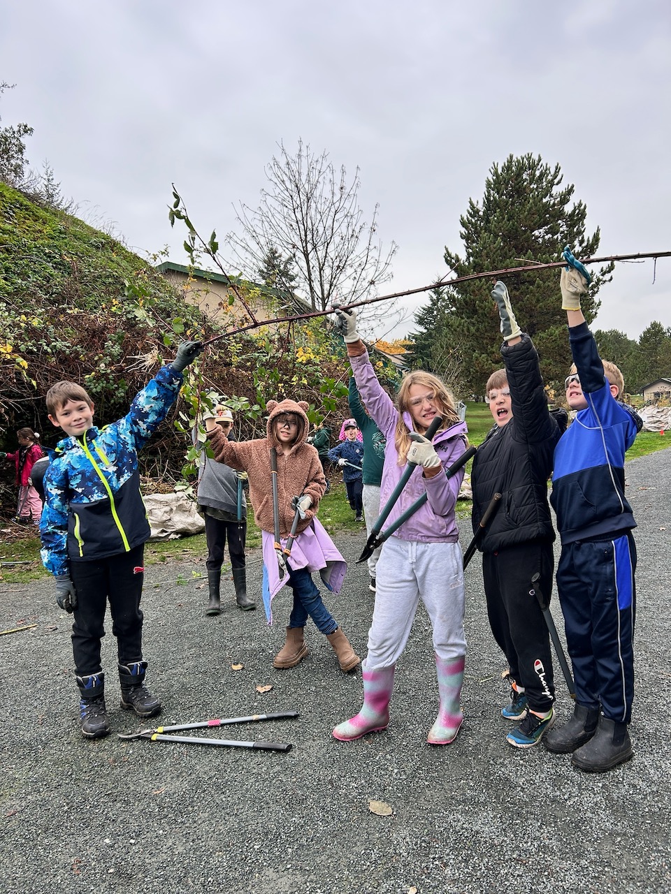 - Grade 3–5 students from View Royal Elementary (which has been around since 1949 and is a school that believes strongly in students learning in nature!) walked down from their school through the neighbourhood to participate in hands-on ecological restoration at View Royal Park